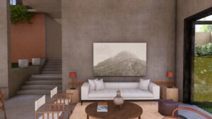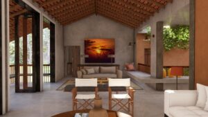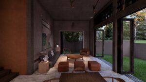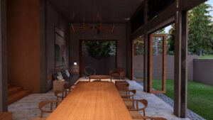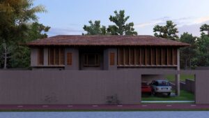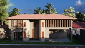 This home in Homagama embraces a tropical monsoon style, centered around a courtyard that brings in light, ventilation, and a seamless connection between indoor and outdoor spaces. Natural materials, textured surfaces, and open layouts create a harmonious, airy environment that blends modern living with the surrounding landscape.